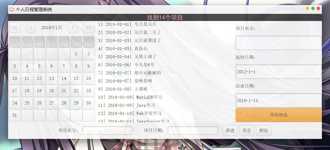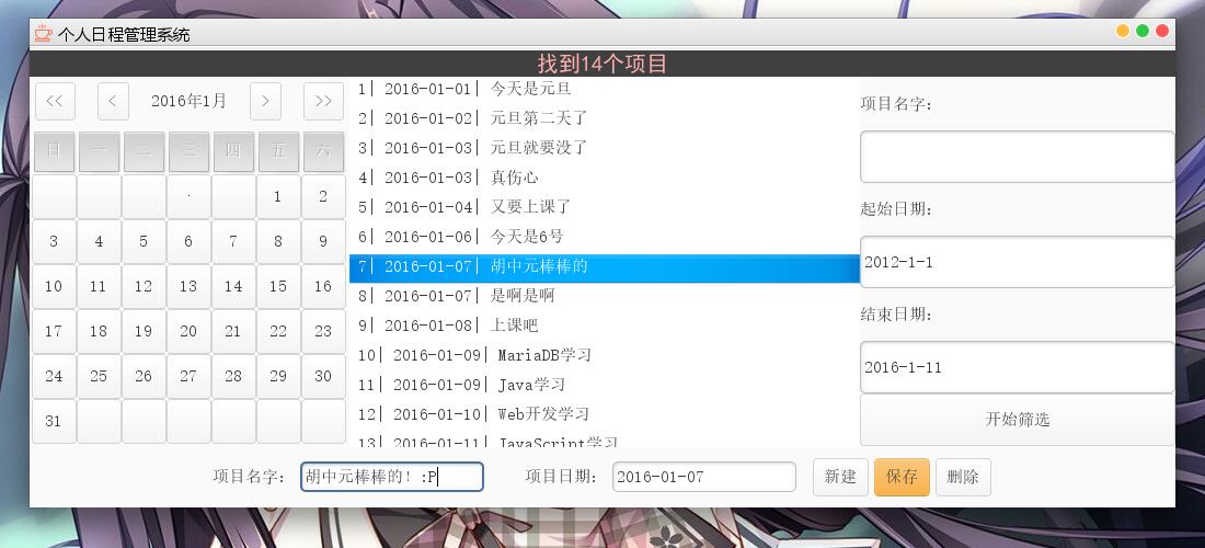 大二上学期 java 课程设计 Eclipse项目: 包含我的“个人日程管理系统”、 何宁宁的“组题系统”、 田梦组的“学生简历管理系统” 我的思维导图存在百度脑图中。 笔记附件 TodoList (2 MB) 2017 年 1 月 8 日 发布者 胡中元 《中原驿站》站长 查看胡中元的所有文章