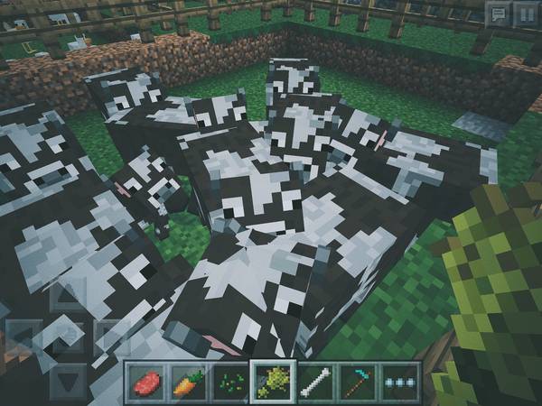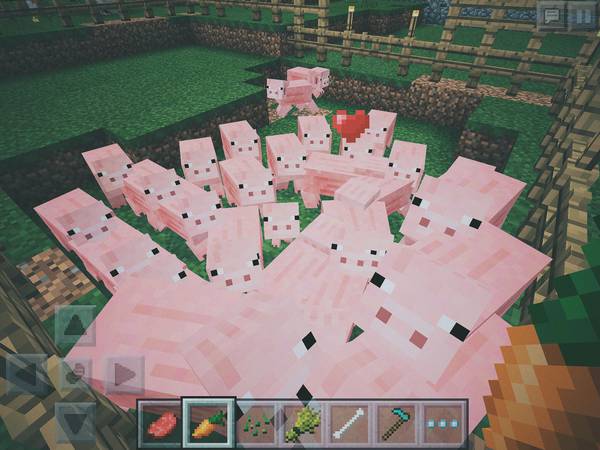 我俩一直是在玩生存模式,因为老婆喜欢打怪。需要说明的是,有些珍贵资源,比如钻石,是深挖找到一批矿后,利用 iPad 版能够无限复制资源的 bug 得到的。猪牛羊鸡四大家畜,是从地图各个角落引来,疯狂繁殖得到的,这个没法复制。狗也是。
