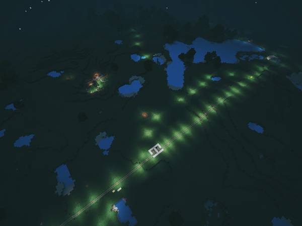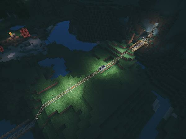 隧道里真是没有了。一出隧道我就被连人带车炸翻在隧道外。一群 creeper 等着炸我呢。于是就把铁路沿线也全点亮了,还设置了驿站,这下不怕怪物了。