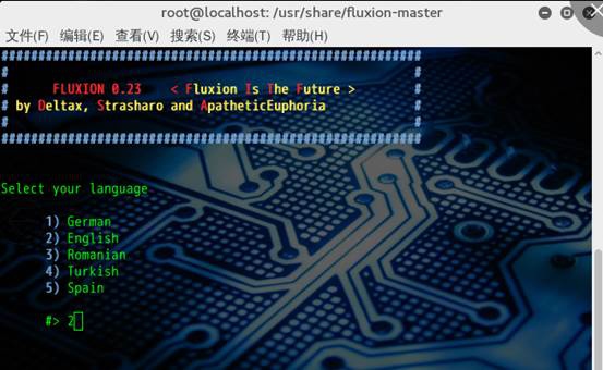 有了握手包之后,我们可以使用字典来猜解密码,但是耗费时间较长,我们这次采用建立虚假 AP 的方式来骗取密码,所以我们选择 1。然后它会叫我们选择语言,我还是选择了英语