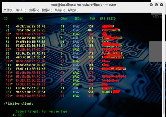 我选用的是信号最好的要测试的 Huawei(已抹去部分名字),选择好目标之后按 ctrl-c 停止扫描,按照目标前面的数字序号选中目标就可以了,我这里是 18。按 r 是重新扫描