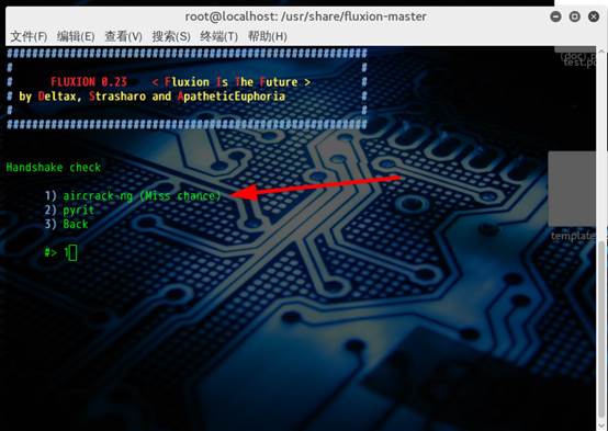 随后选择 1,其目的是选择 aircrack-ng 开始抓取握手包。