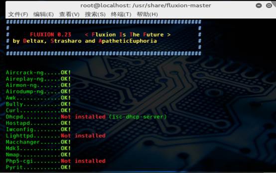 有一些依赖没有安装的,fluxion 未成功打开,fluxion 也会提醒你安装,图片中红色的字体是需要安装的组件。