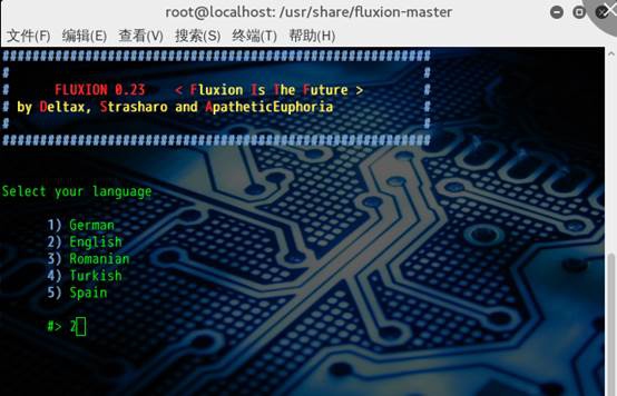 选择语言之后 fluxion 会让你选择网卡,因为是无线网络,只有一个无线网卡,就选 1