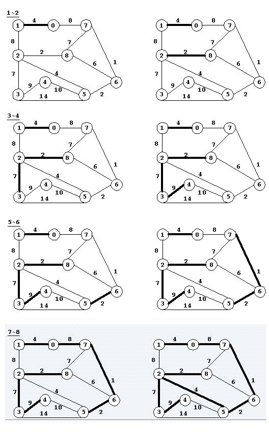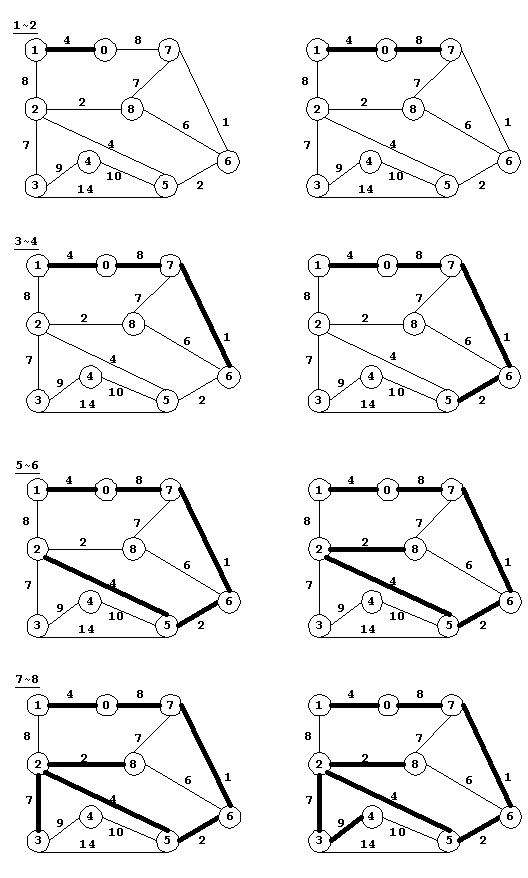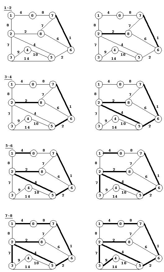 (1~8)示了算法的过程,其中(1~6)为第一次遍历过程,并得到三个子树形成的森林;(7~8)为第二次遍历过程,得到最终的最小支撑树。算法过程中跟踪每次遍历后等价类的变化。